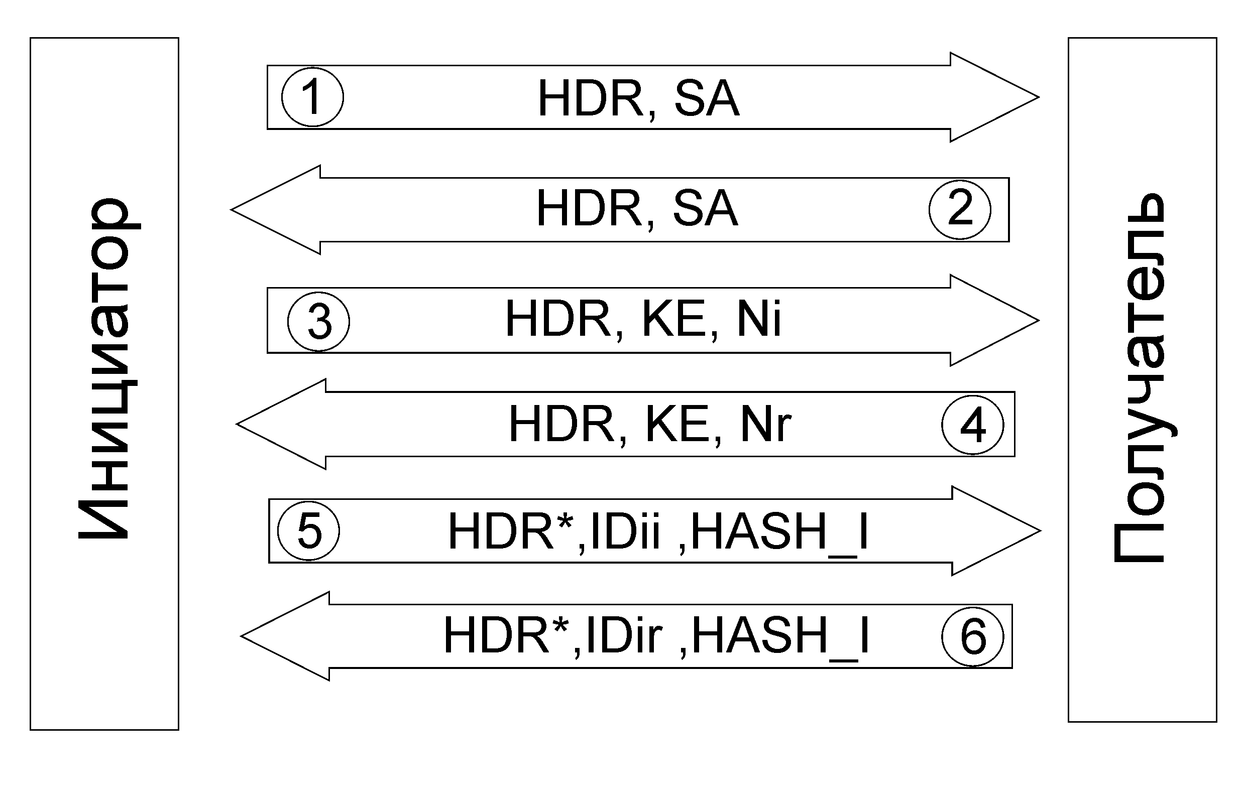 | Описание | Обмен данными при идентификации IKE с помощью разделяемого ключа в основном режиме фазы 1 |