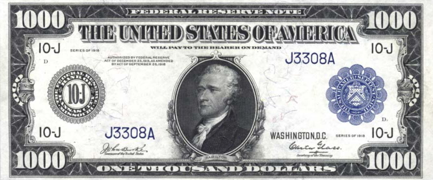 | Описание | 1000 dollars bill (not in use today) Series: 1918 Portrait: Alexander Hamilton Back Vignette: Eagle |