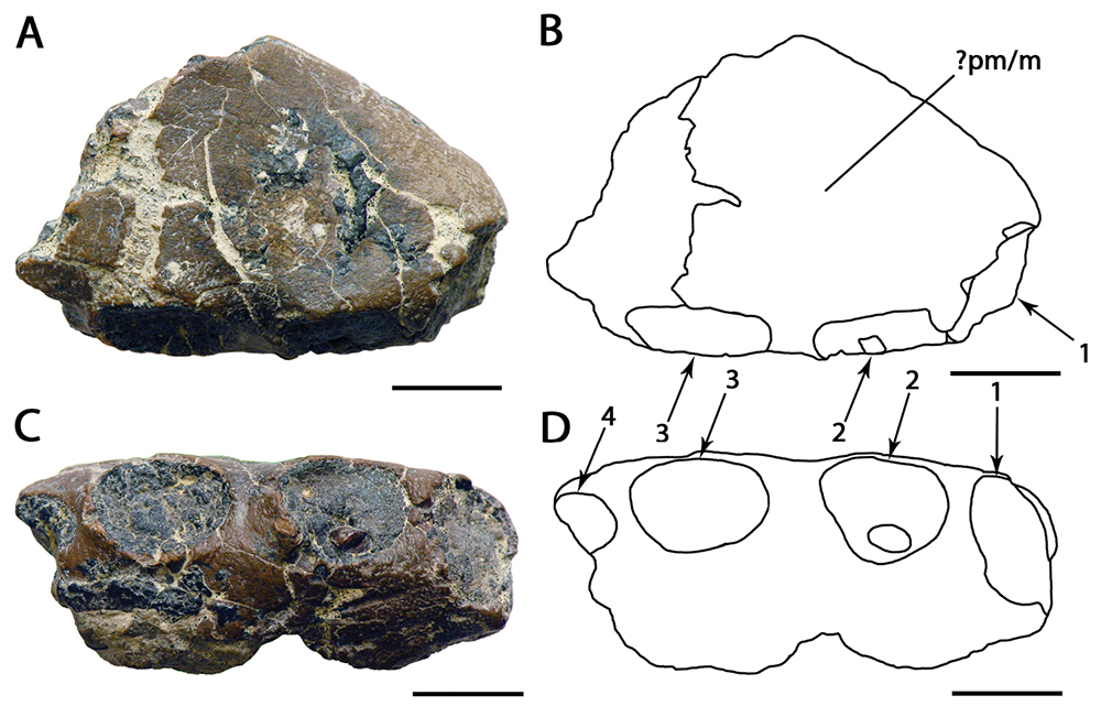 | Описание | A–D Ornithocheirus crassidens, holotype CAMSM B 54499 (Albian, Cambridge Greensand), anterior fragment of the rostrum. A right lateral view B respective line drawing C ventral view D respective line drawing. |