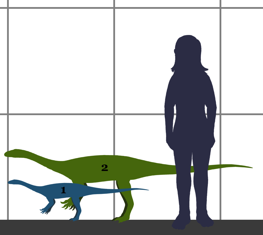 | Описание | Size of Anchisaurus (Sauropsida, Dinosauria, Saurichia, Sauropodomorpha, Anchisauridae), compared to a human. 1. Size of adult specimen (about 2 meters). 2. Smaller specimen published by Galton, 1976.[#cite_note-1 [1]]References