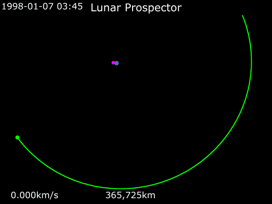 | Описание | Animation of Lunar Prospector's trajectory from 7 January 1998 to 19 January 1998 ▇ Lunar Prospector · ▇ Moon · ▇ Earth |