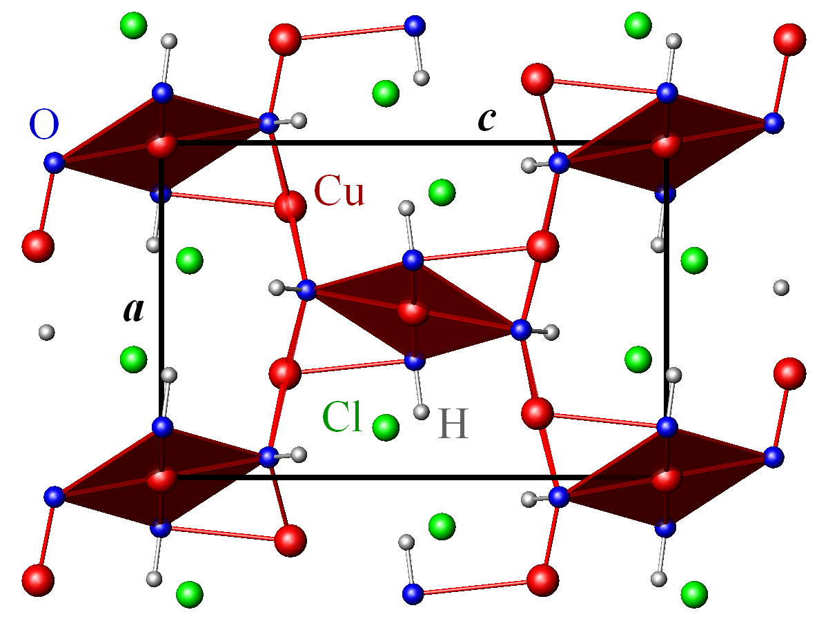 | Описание | Crystal structure of atacamite, Cu2Cl(OH)3, Pnma. Red: copper, green: chlorine, blue: oxygen, gray: hydrogen. |