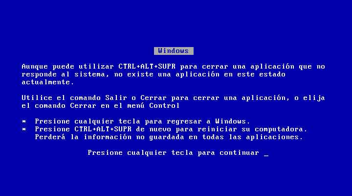 | Описание | The blue screen that appears when Control + Alt + Delete is pressed in the Spanish version of Windows 3.1, in 386 enhanced mode. |