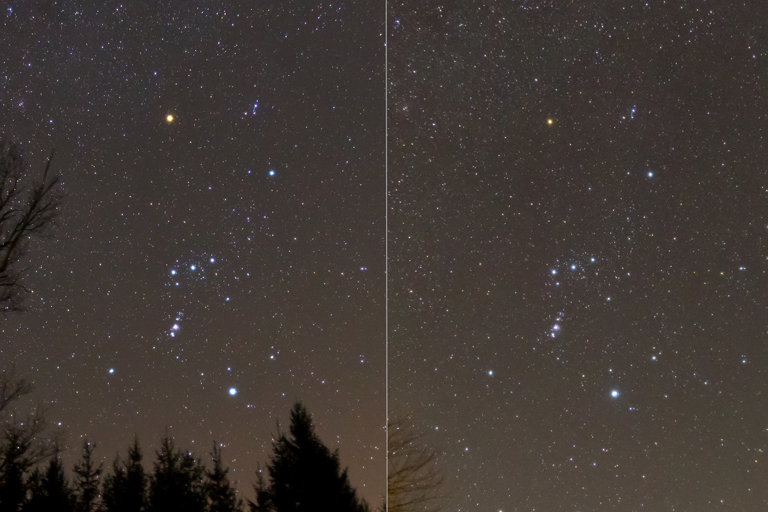 In late 2019 and early 2020, however, Betelgeuse has undergone a unusually deep minima, when it's magnitude dropped to about +1.6. That is, it shone at less than 40% of it's usual luminosity, so it's brightness was compareable to Bellatrix (Gamma Orionis), the other shoulder star (+1.6 mag). In this view, the usual appearance of Orion (left, in an image taken on Feburary 22, 2012), is compared with a image taken taken on February 21, 2020 (right), clearly showing the unusual dimming of the red giant star. Both images were taken with identical setup and exposure data: Each is a 30 second exposure taken with a Canon EOS 550D camera at ISO 3200, 17mm f/2.8 lens, Cokin P830 diffusor, tracked with the Vixen Polarie star tracker). |
