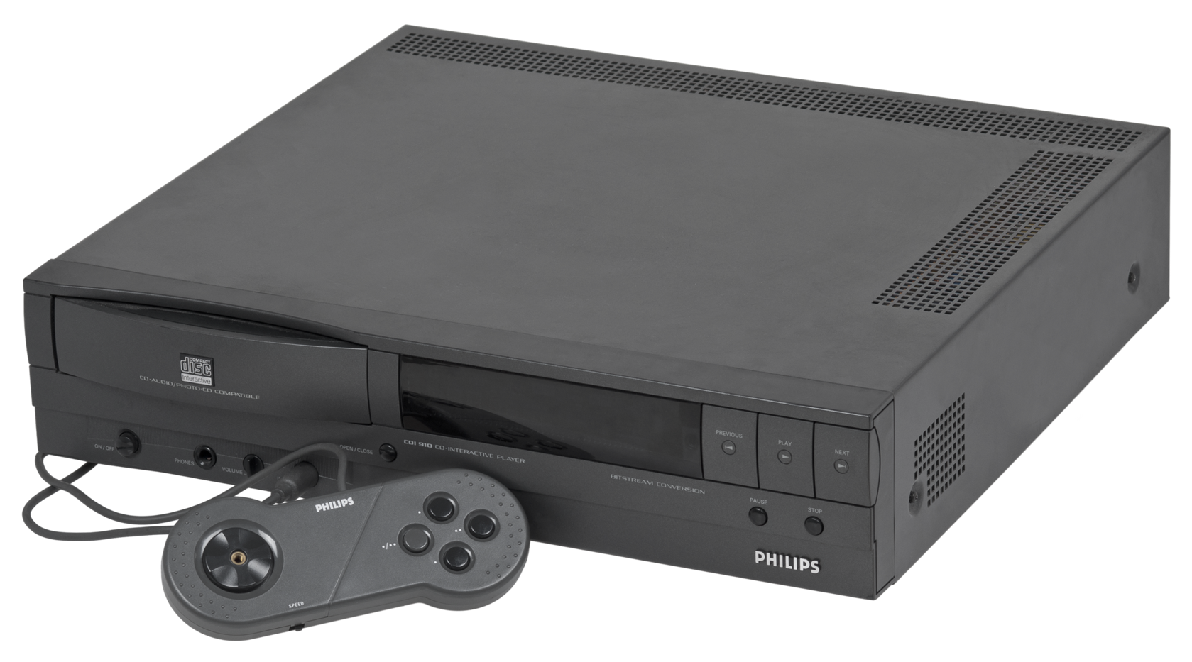| Описание | A Philips CD-i 910 video game console, shown with controller. |