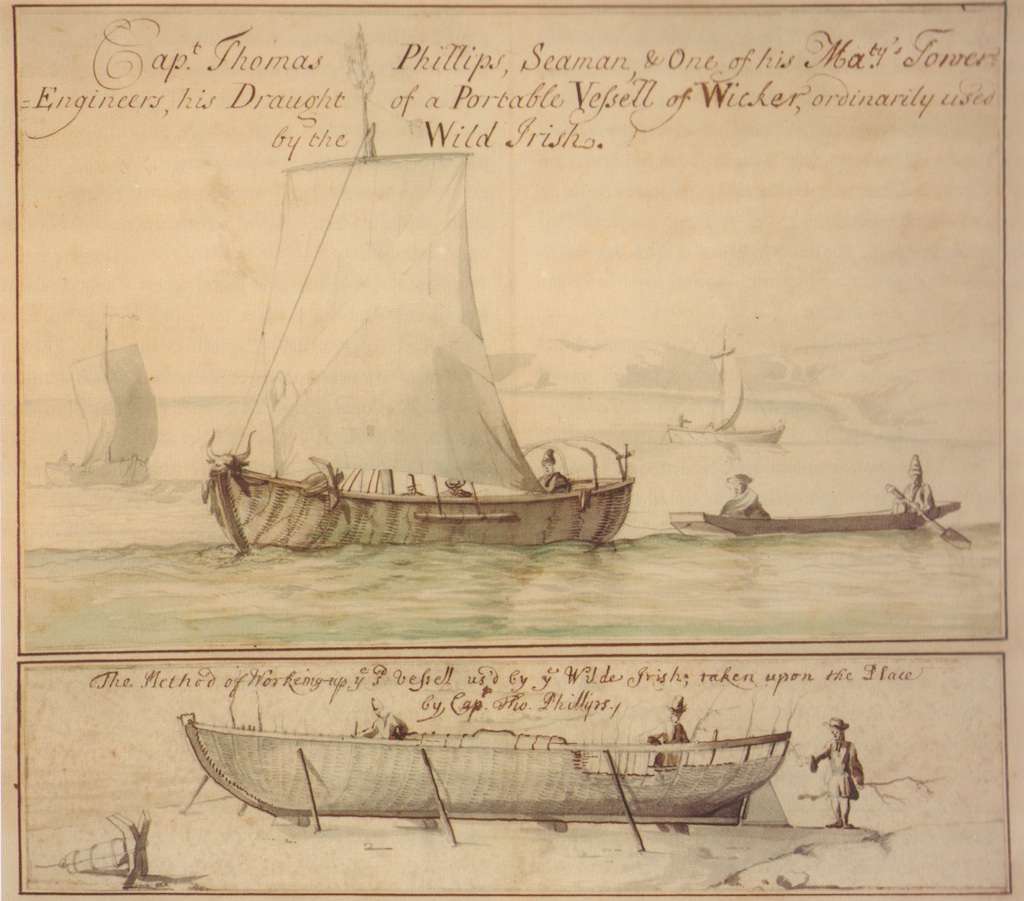 | Описание | Above: "Capt. Thomas Phillips, Seaman & one of his Maty's Tower - Engineers his Draught of a Portable vessell of Wicker, ordinarily used by the Wild Irish"; Below: "The Method of Workeing up ye sd vessel by Cap. Tho. Phillips". |