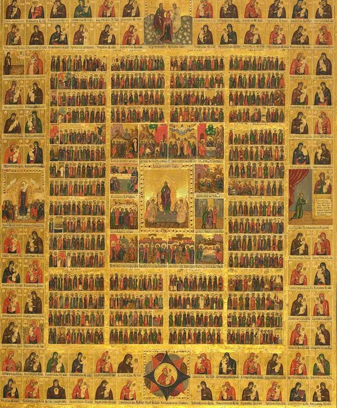 | Описание | Icon of Chetyi-Minei (calendar of saints).In the very center is the Resurrection of Christ surrounded by scenes from Holy Week and the feasts of the Paschal cycle. Around them are twelve groupings of saints: one for each month of the calendar year. In the border are icons of the Theotokos (Mother of God), each of which has a feast day during the liturgical year. |