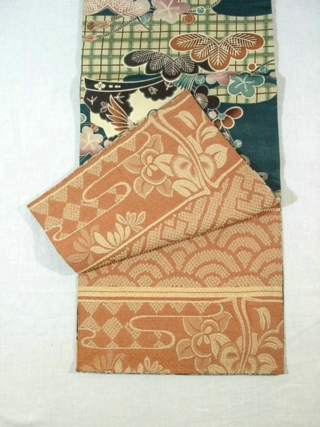 | Описание | This is a vintage chūya obi. One side is made of plain silk, and has exotic dyed pattern - 'dōkyō'(copper mirror), mallet and other traditional motifs are dyed. Another side is 'kōkechi', which has exotic woven pattern. |