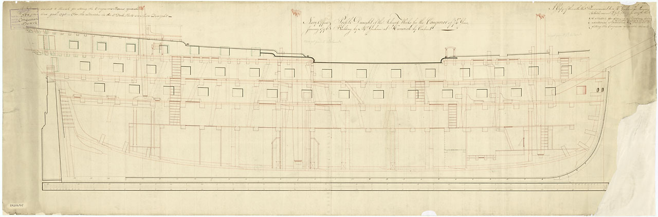 | Описание | Plan showing the inboard profile for Conqueror (1801), a 74-gun Third Rate, two-decker. |