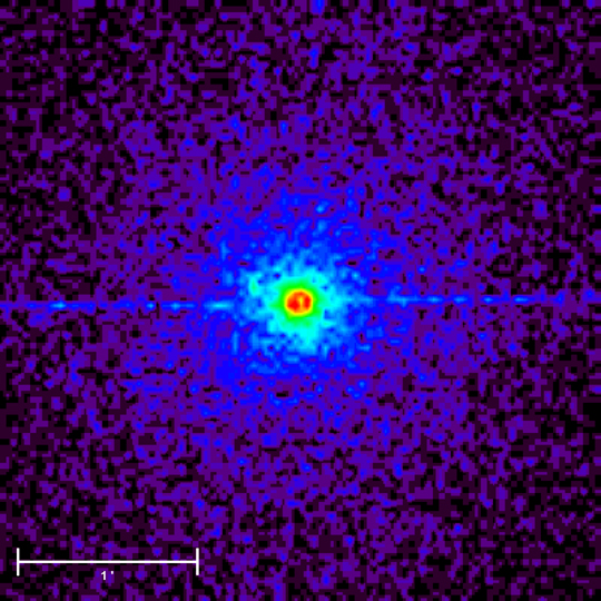 | Описание | Halo around the X-ray source Cygnus X-3. The halo (beyond the yellow ring in the center) is due to scattering of the x-rays by interstellar dust grains along the line of sight to the source. The sharp horizontal line is an instrumental effect. |