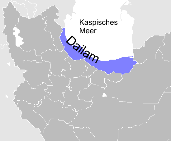 | Описание | Die historische Region Dailam am Kaspischen Meer. Farbig hinterlegt sind die heutigen iranischen Provinzen Gilan (links) und Māzandarān (rechts). |
