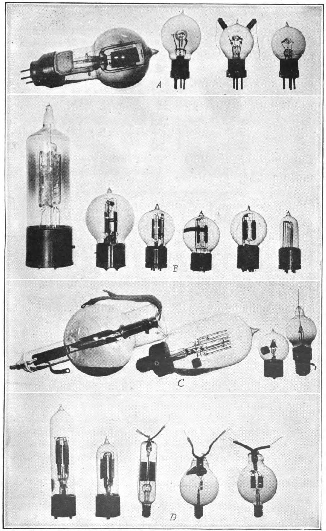 The triode consists of an evacuated glass bulb with three electrodes inside: a heated filament, a control grid consisting of a screen of wires, and a metal plate. The American tubes (B), (C), and (D) were all constructed with a filament in the center, with the grid consisting of two flat screens on either side, and the plate consisting of two flat metal plates outside that. The French tubes (A) had a horizontal filament wire, surrounded by a grid consisting of a helix of wire, surrounded by a concentric plate consisting of a metal cylinder. The smaller tubes on the right of each row were used in radio receivers, while the larger tubes to the left were higher power types used in transmitters. |