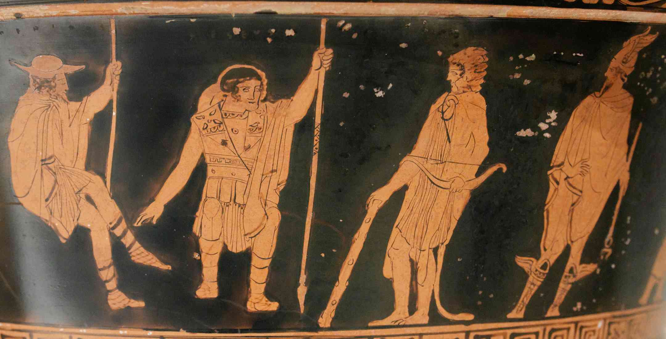 | Описание | Herakles, Theseus and Pirithoos in Hades, with Hermes. Upper tier, side A of an Attic red-figure calyx-krater. |