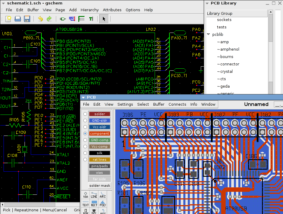 | Описание | Screenshot of gEDA software (gschen, pcb) |
