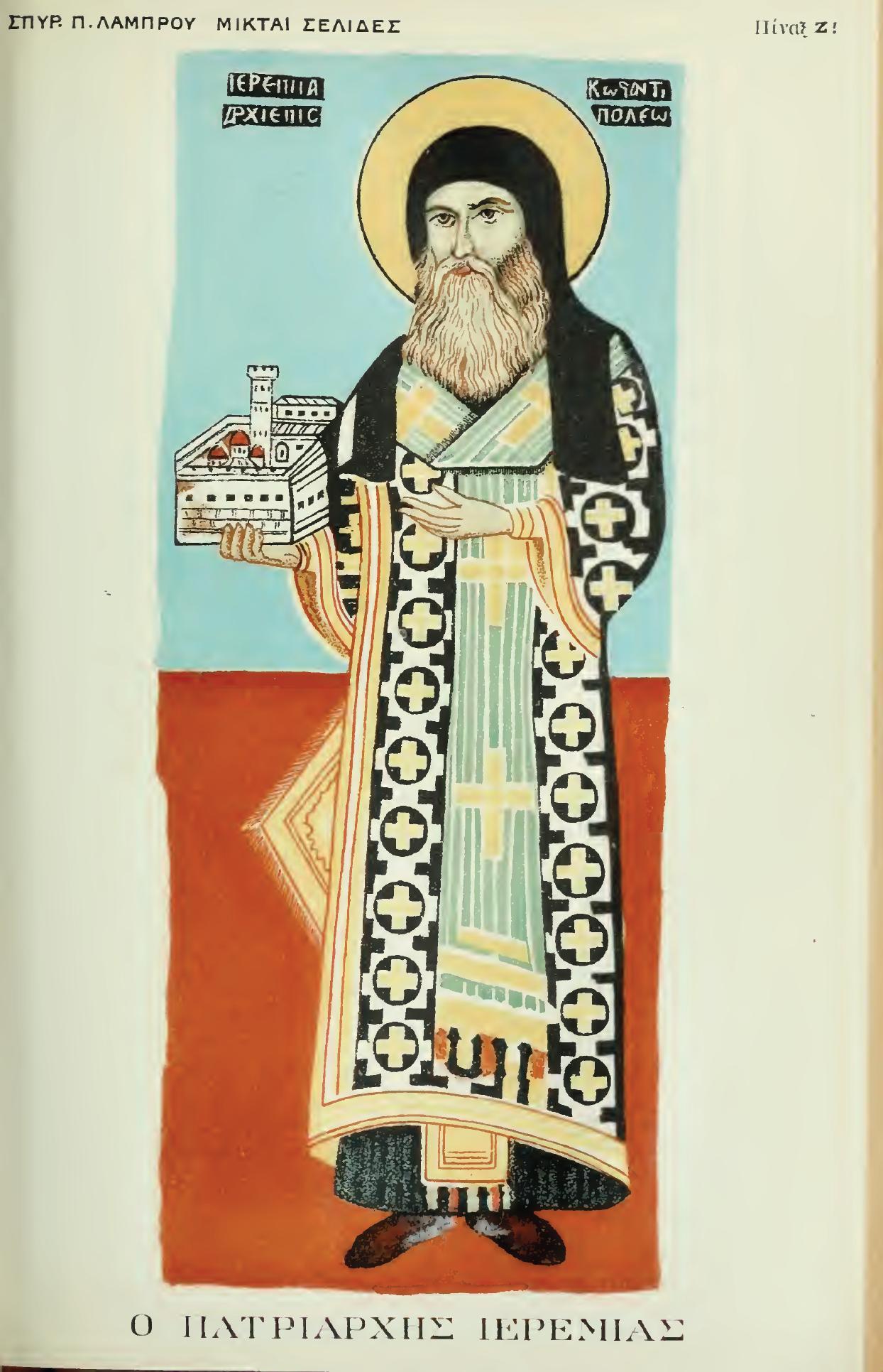 Источник файла — сайт Wikimedia Commons, куда он был загружен под одной из свободных лицензий ( https://commons.wikimedia.org/wiki/File:Ieremias_I..JPG ). Авторов, работавших над этим файлом см. в истории файла: https://commons.wikimedia.org/w/index.php?title=File:Ieremias_I..JPG&action=history