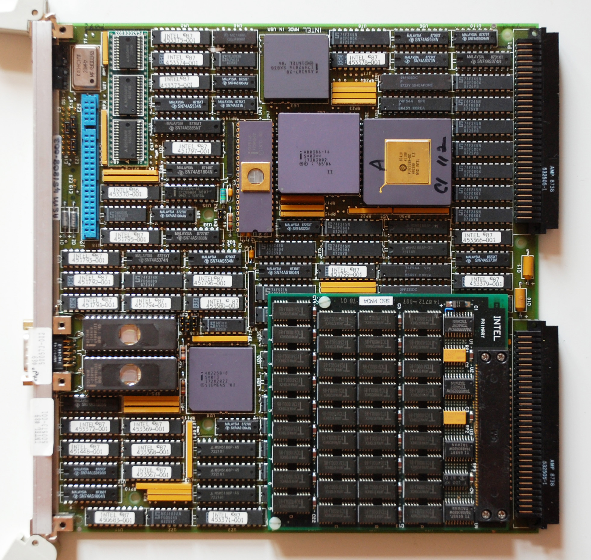 | Описание | Intel iSBC 386/116 Multibus II Single Board Computer with A80386-16 S40344 CPU, A80387-20 SX030 FPU, 82389 Intel/VLSI Multibus II Controller, Intel A82258-8 SX013 ADMA-Controller, C8751-8 (modified) EPROM Controller, Intel D27010 EPROMs and RAM-Board. Taken from an IBM-PC. |