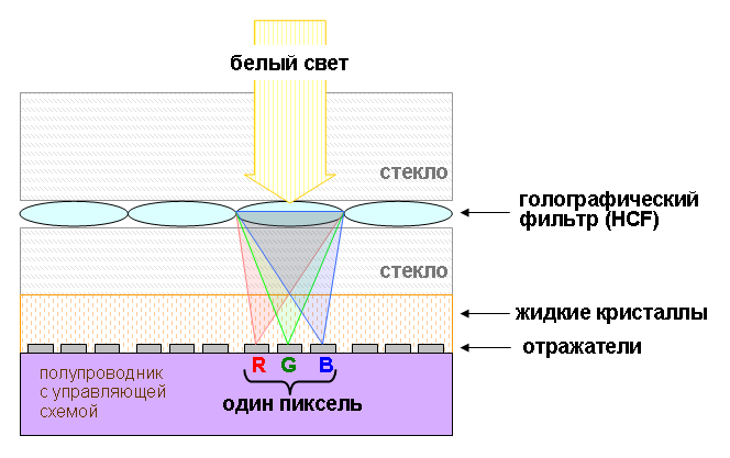 | Описание | Scheme of LCoS (Liquid crystal on silicon) Microdevice with HSF (Hologram Color Filter)