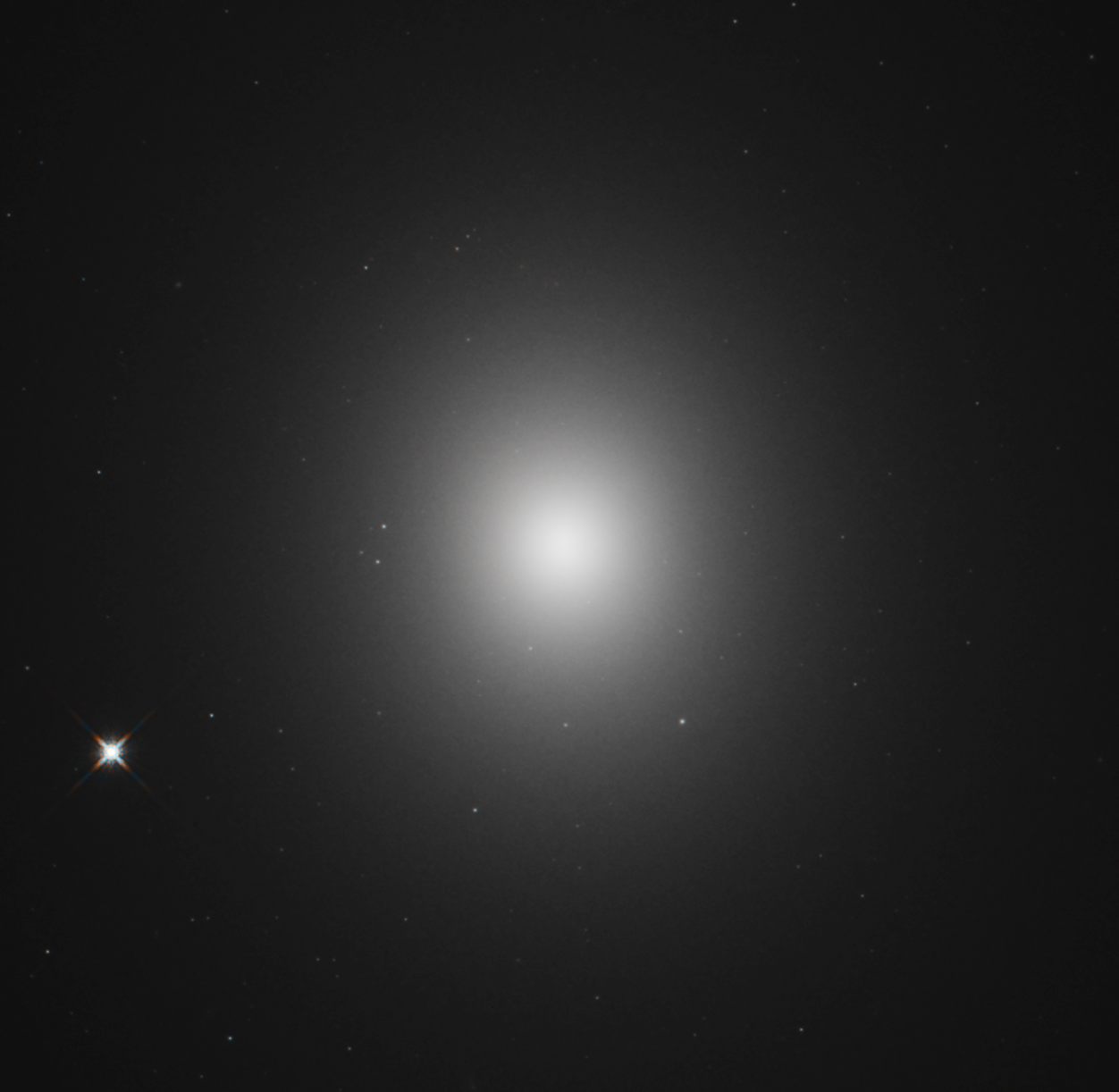 | Описание | Messier 49 The elliptical galaxy M49 was discovered by Charles Messier in 1771. Not only was it the first object discovered in the Virgo Cluster of galaxies, but it was also the first elliptical galaxy detected outside of the Milky Way’s Local Group. Unlike spiral galaxies that have well-defined structures and picturesque spiral arms, elliptical galaxies are fairly featureless with little structure. The stars in elliptical galaxies are usually much older than those in spiral galaxies. M49 also contains a rich collection of globular star clusters — nearly 6,000. This Hubble image of M49 was created using observations at infrared wavelengths. There is an X-ray source at the core of the galaxy, indicating that a supermassive black hole lurks at the center of M49. The estimated mass of this supermassive black hole is roughly 565 million times the mass of our sun. M49 is located 60 million light-years from Earth in the constellation Virgo. It has an apparent magnitude of 9.4 and can be observed using a pair of binoculars. The best time to observe the galaxy is during the month of May. |