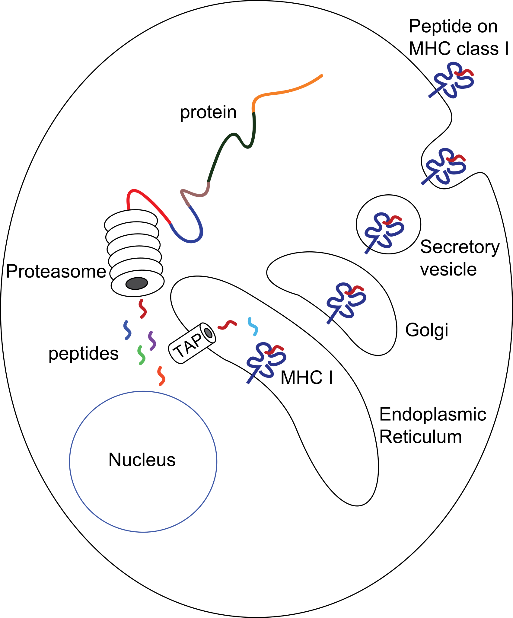 | Описание | Simplified diagram of cytoplasmic protein degradation by the proteasome, transport into endoplasmic reticulum by TAP complex, loading on MHC class I, and transport to the surface for presentation |