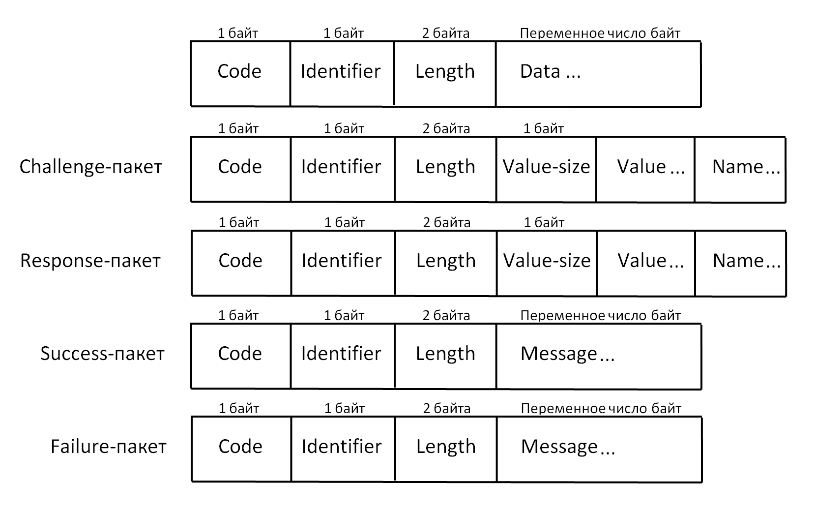 | Описание | Форматы пакетов, передаваемых в протоколе MS-CHAPv2. Общий вид, Challenge-пакет, Response-пакет, Success-пакет и Failure-пакет. |