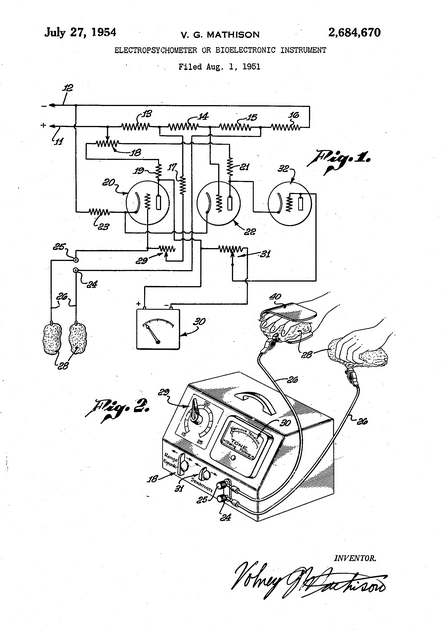 | Описание | Electropsychometer or bioelectronic instrument. Illustration in application for US Patent 2684670. |