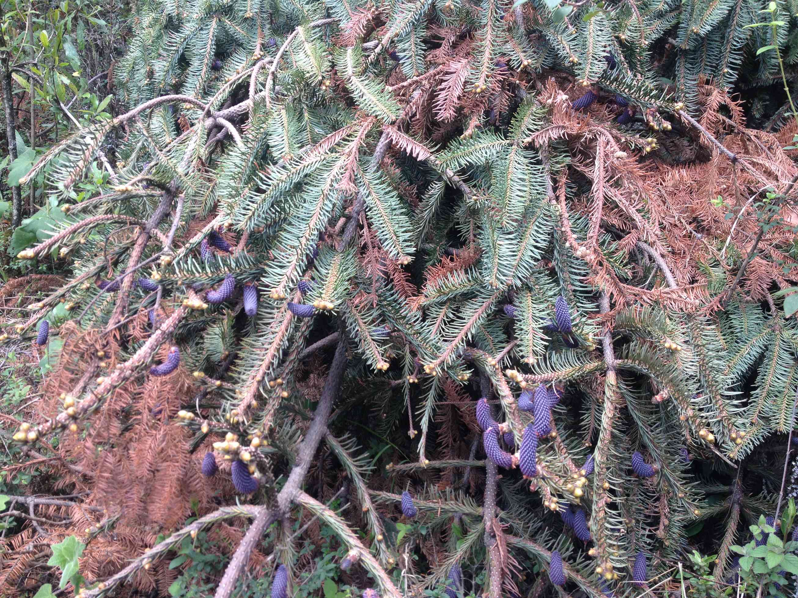 | Описание | Sacred Fir Abies religiosa wilted leaves and cones on a broken or cut branch |
