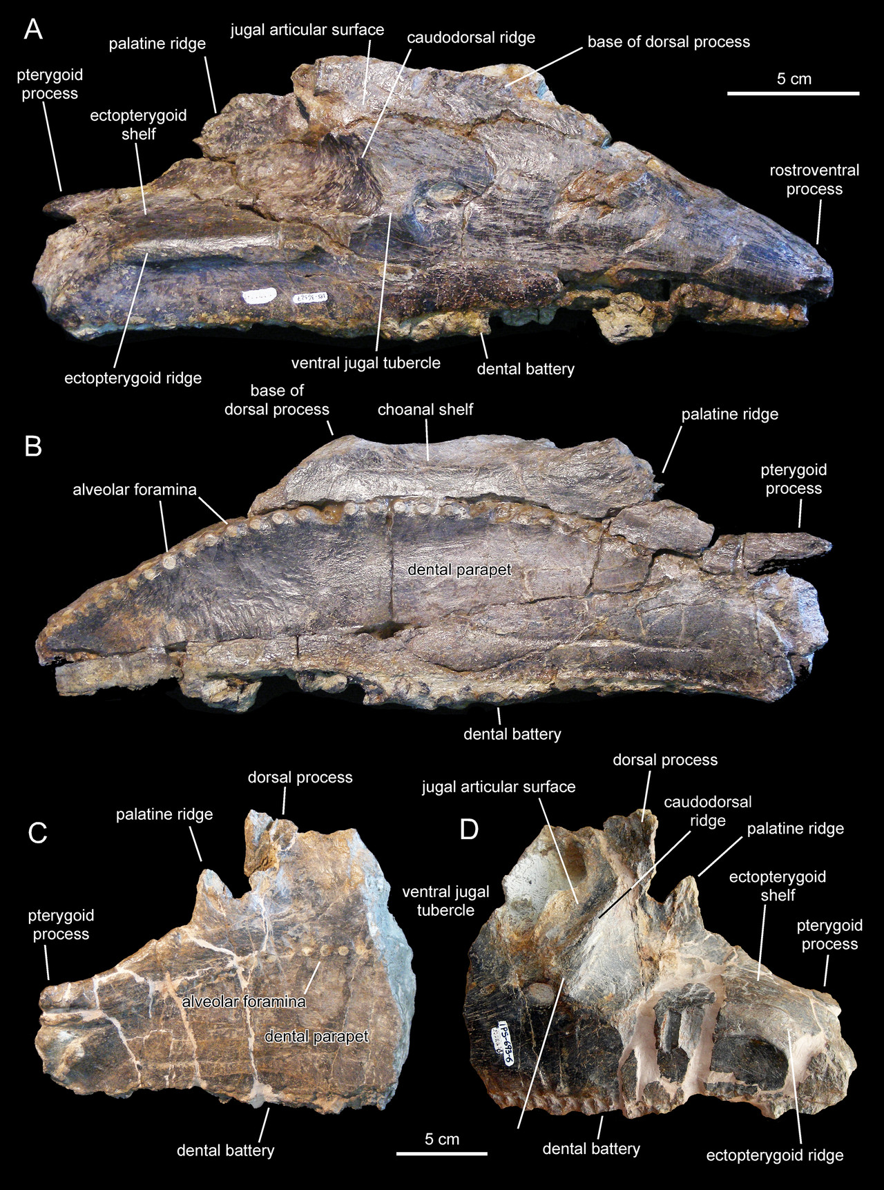 | Описание | Pararhabdodon isonensis, maxillae. A. Right maxilla (IPS 36327) in lateral view. B. Medial view of same. C. Left maxilla (IPS 693-6) in medial view. D. Lateral view of same. |
