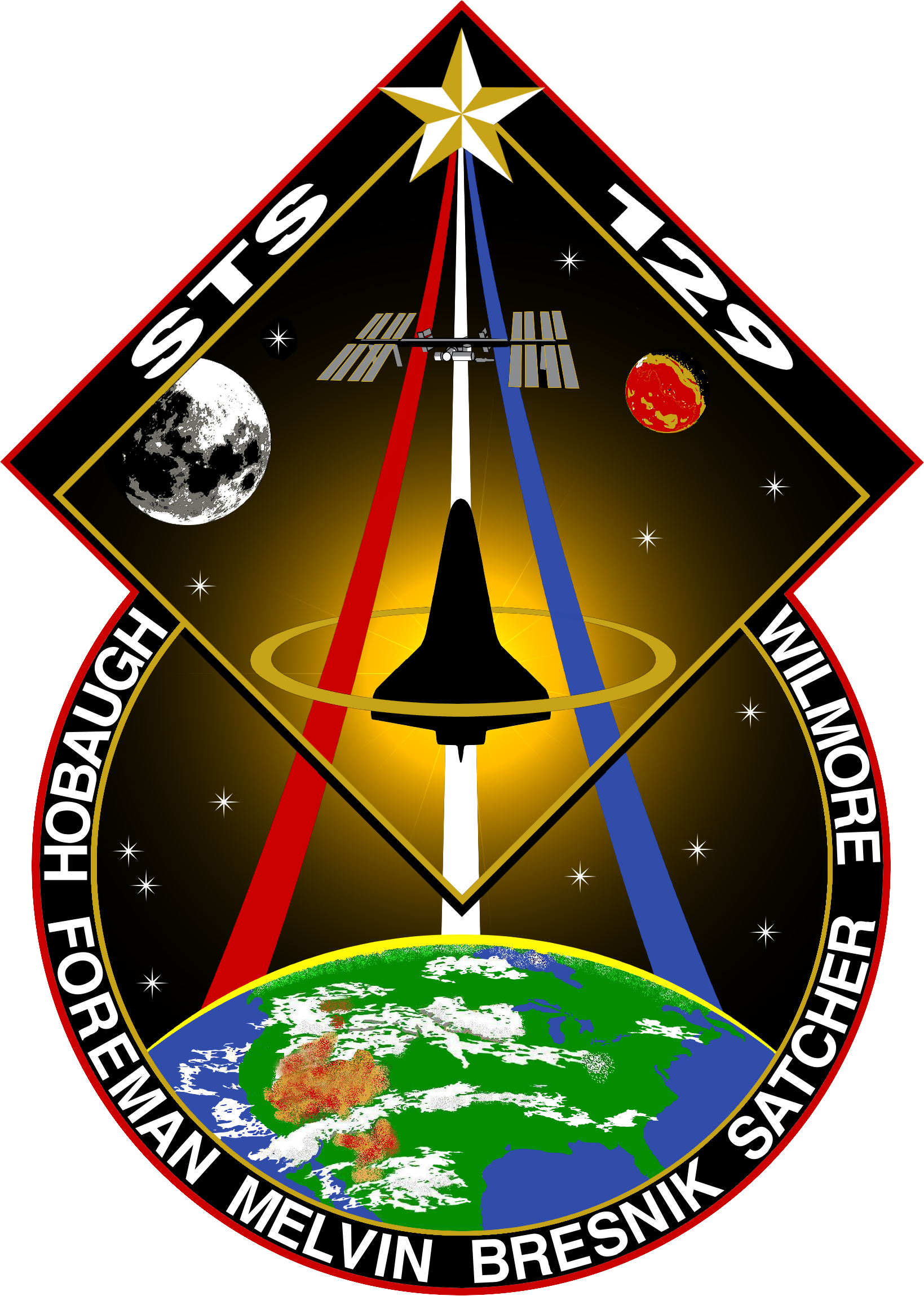 | Описание | For STS-129 the sun shines brightly on the International Space Station (ISS) above and the United States below representing the bright future of U.S. human spaceflight. The contiguous U.S., Rocky Mountains, and Great Desert Southwest are clearly visible on the earth below encompassing all the NASA centers and the homes of the many dedicated people that work to make our Space Program possible. The integrated shapes of the patch signifying the two Express Logistics Carriers that will be delivered by STS-129 providing valuable equipment ensuring the longevity of the ISS. The Space Shuttle is vividly silhouetted by the sun highlighting how brightly the Orbiters have performed as a workhorse for the U.S. Space Program over the past 3 decades. The Space Shuttle ascends on the Astronaut symbol portrayed by the Red, White and Blue swoosh bounded by the gold halo. This symbol is worn with pride by this U.S. crew representing their country on STS-129. The names of the crew members are denoted on the outer band of the patch. As STS-129 launches, the Space Shuttle is in its twilight years. This fact is juxtaposed by the 13 stars on the patch which are symbolic of our children who are the future. The Moon and Mars feature predominantly to represent just how close humankind is to reaching further exploration of those heavenly bodies and how the current Space Shuttle and ISS missions are laying the essential ground work for those future endeavors. |