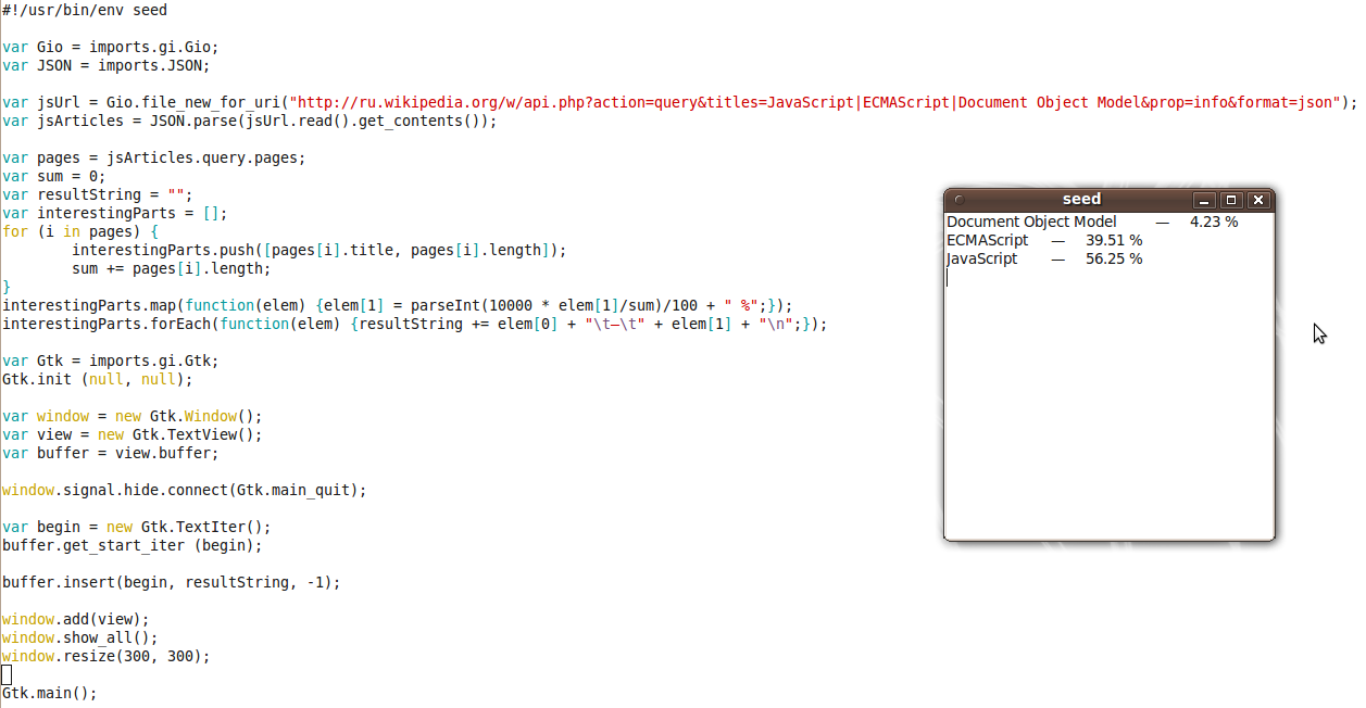 | Описание | Source code and screenshot of JavaScript application made with Seed for GNOME environment. |