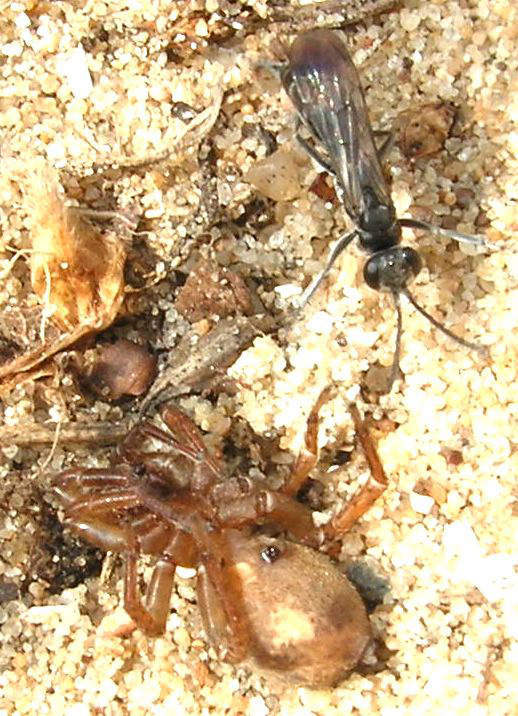 | Описание | A spider wasp (family Pompilidae, Pompilus sp.?) with its prey. Photo from dunes near Heemstede, The Netherlands. |